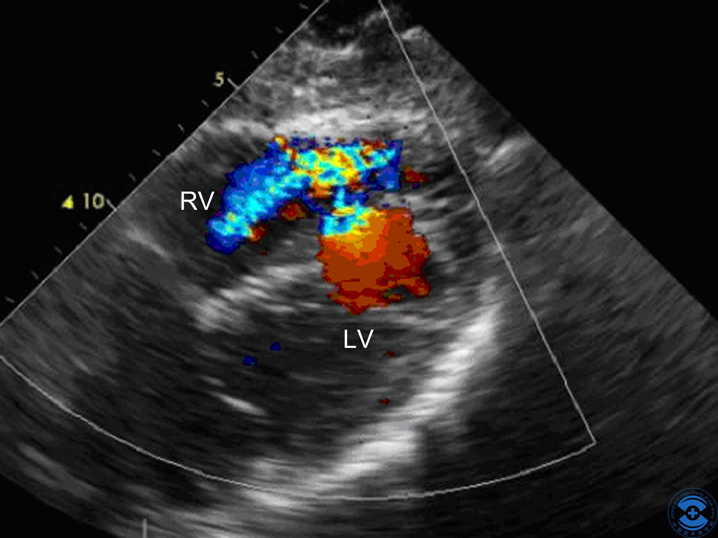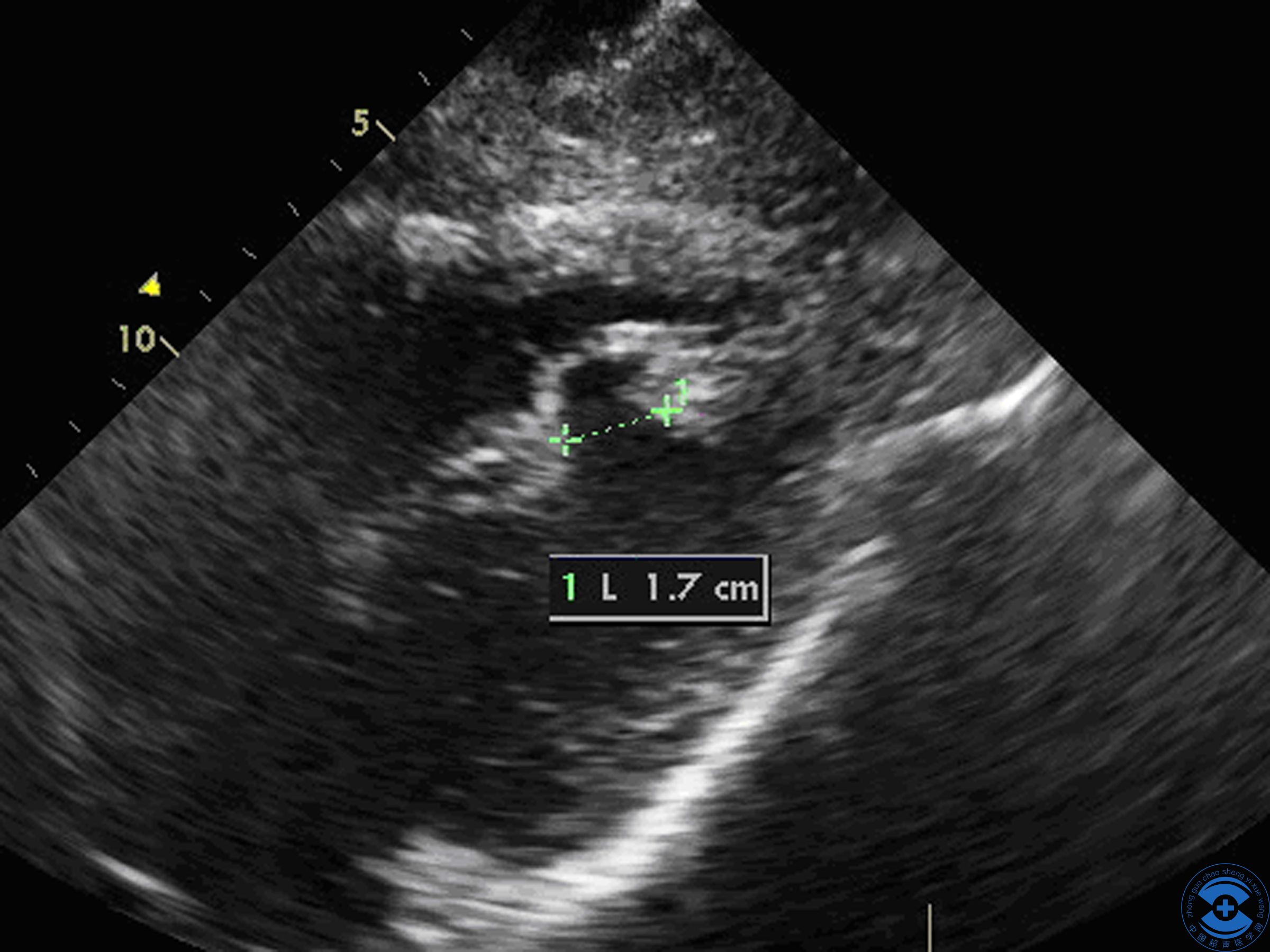 图1 后间隔心尖段回声中断:剑突下四腔心切面见后间隔心尖段回声中断,左室面中断约