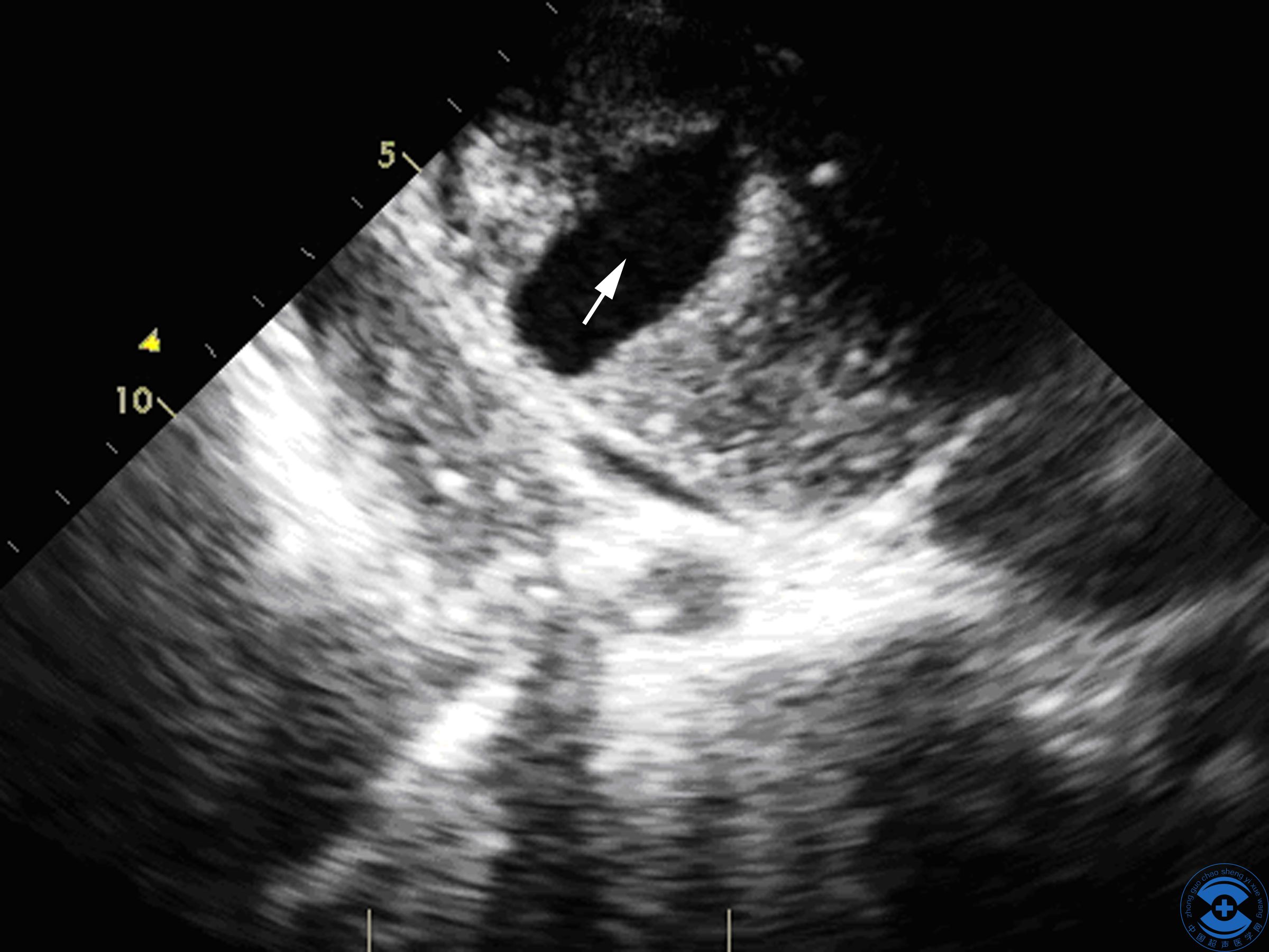 图3室间隔内裂隙:探头由心尖两腔心切面向下倾斜,箭头所示为带状非贯通性撕裂伤