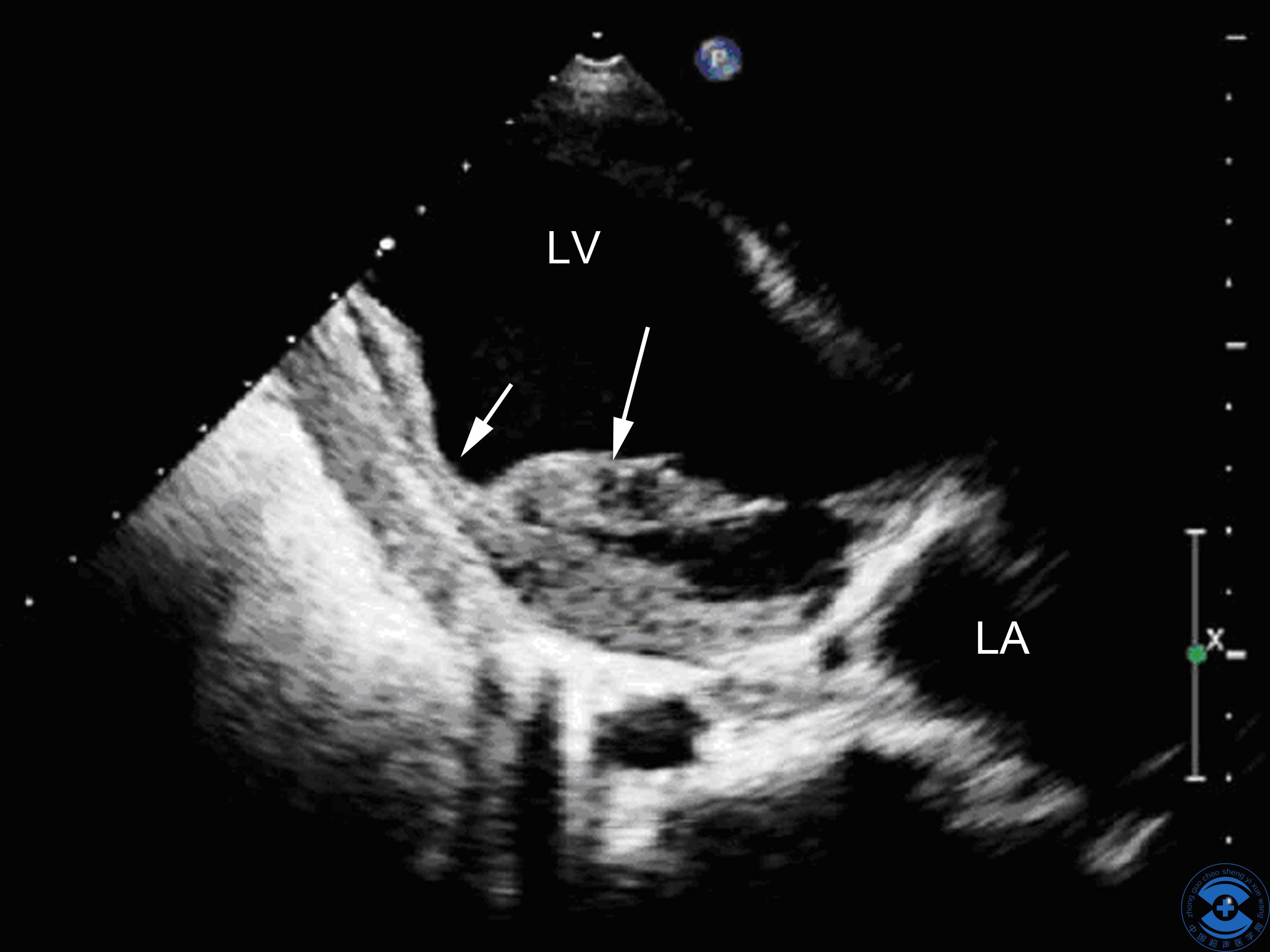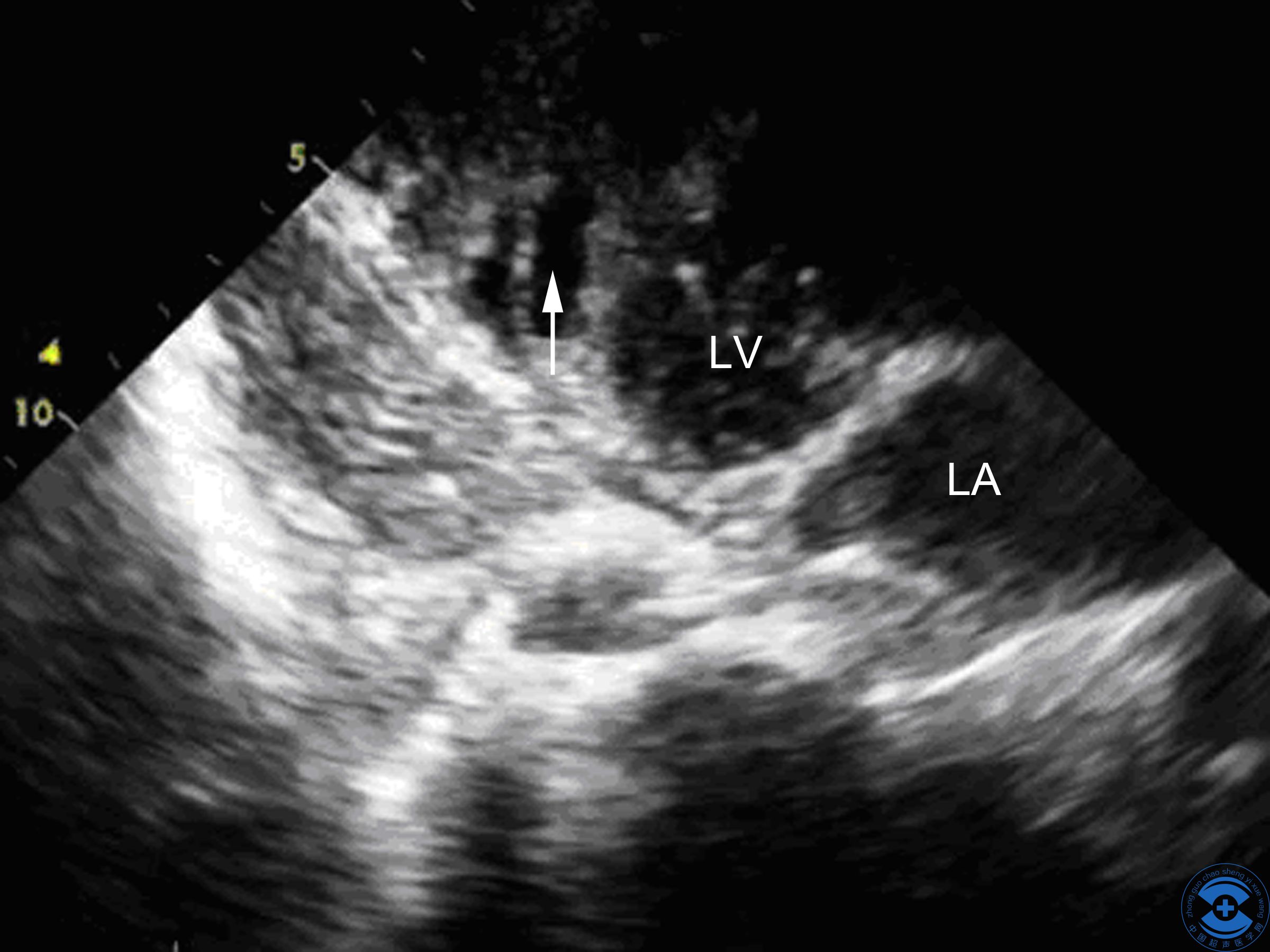 图5 术后超声:术后心尖两腔心切面,短箭头为裂隙修补后的图像,长箭头为乳头肌